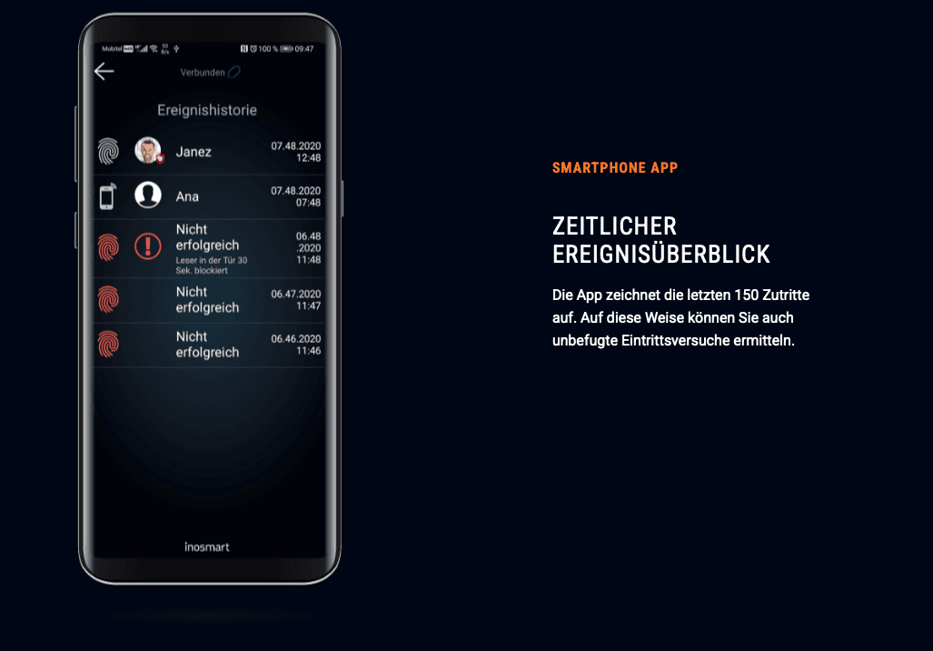 Die Verwaltung erfolgt über die Inosmart-App, in der sich Nutzer anlegen, Berechtigungen vergeben und Ereignisse einsehen lassen.